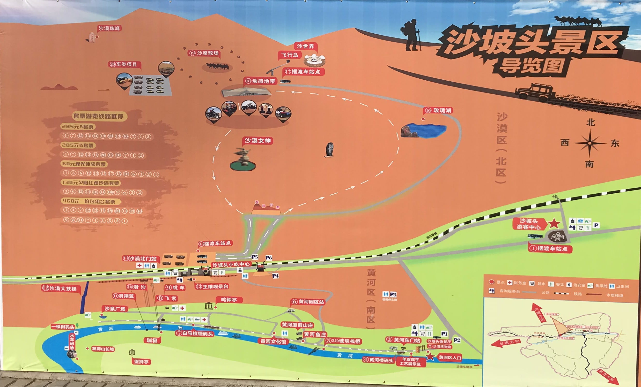 悠悠歲月,由古而今。天賜奇景與人們的不懈創(chuàng)造,使如今的沙坡頭已不是古時的沙陀頭,它融自然景觀、人文景觀、治沙成果于一體,被世人稱之為“世界沙都”、“世界壟斷性旅游資源”。在這里,“大漠孤煙直,長河落日圓”的古詩意境得到最完美的體現(xiàn);滑沙聽鐘,坡底戲泉,物我兩忘,其樂無窮;黃河弄筏,追波逐浪,驚險刺激;騎駝踏沙,體驗沙海輕舟之浩渺,觀大漠日落日出之壯美;觀星賞月,聽沙漠夜聲之神秘;圍篝火,飲酒吃肉,狂歌勁舞,大漠探險神秘引人;古老的河灣水車,輪轉(zhuǎn)水瀉,澆田灌園,別有情趣;沙下果園,疊翠流紅,鳥語花香,瓜甜果艷,令人流連忘返;“一線牽南北”的雙架索道,可實現(xiàn)凌空跨河比翼雙飛的夢想;古老的黃河木帆船、赤背的纖夫,將“妹妹你坐船頭,哥哥我岸上走”的歌曲變?yōu)楝F(xiàn)實美的享受;空中飛行、高空跳傘走出影視蒙太奇,飄落沙山;沙雕、沙療、沙浴和沙漠球類、沙漠田徑等形式多樣的“沙”字號體育健身競技項目,融智慧、趣味、知識、健身為一體;民族風情演出、黃河梨花節(jié)、大漠黃河國際旅游節(jié),形式新穎,內(nèi)容獨特。將在5月4日舉行的大漠舞龍大賽,百余條巨龍在浩瀚的騰格里大漠騰滾翻飛,場面恢宏,氣勢雄偉,鑼鼓震天,令人心動……這,就是今日之全新的沙坡頭旅游區(qū),2000年被國家評定為AAAA級旅游區(qū),它是寧夏人之驕傲,是馳名中外的旅游勝地。