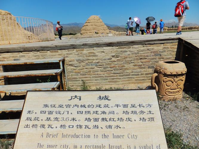 月城北側為內城遺址,四面用神墻環(huán)繞,呈南北長方形,南北長180米,東西寬160米。占地約40畝。神墻中部較窄,靠近轉角漸寬大,純凈黃土分段夯筑而成,中部每段約3米,殘高約3米,比較平齊,各段如須彌座形狀。神墻四處轉角皆很高大,類圓柱形,從各轉角往神墻兩側,連體圓柱愈來愈矮小,各有5個,共40個。其殘存最高達6米以上,最低的3米,發(fā)現(xiàn)在轉角處5個連體圓柱夯土臺周圍皆有磚瓦殘存。內城四面神墻皆正中辟門,門址寬約12米,地面散布瓦片、脊飾殘塊等。根據統(tǒng)計,內城坍塌墻體在2002年時已達189.1米,約占墻體總長度的27.8%。南神門內約25米偏西處有一處獻殿遺址。根據考古發(fā)掘情況看,可能原為一正方形臺基,臺面周長65米,直徑約20米,堆積厚約1米。臺基以純凈黃土墊起,其上及周圍殘存大量青磚灰瓦及琉璃構件。獻殿之后約6米為墓道封土,南北長約42米,呈東南——西北走向,形似魚脊,以砂石填充。其末端為盜坑,盜坑直徑約20米,深約5米?觾乳L有若干小樹,兩側有土堆。內城西北隅有一處陵臺,八角形,高約20米,分7級,每級向內收分。陵臺收分處及周圍地面散布大量瓦片、瓦當、滴水等建筑材料。夯土臺整體形狀為塔形,其上露出一個個椽洞,有水平方向的,還有豎斜方向的,證明原來有椽出頭。距離陵臺較遠的四角各有一座角臺,其中東南、西南的兩座角臺已坍塌,西南角尚可分辨認出臺基,相距約520米。其連線在雙闕臺之前,北面的2座角臺相距290米。東北角臺殘高1米多,坍塌嚴重,只有西北處的角臺保存比較完好,殘高約5米,但嚴重風化。北邊兩角臺相距272米。南北聯(lián)線約460米。夯土臺因剝蝕已趨圓柱形,底面周長20米。純凈黃土夯筑,周圍散落著大量紅褐色板瓦、筒瓦殘片。