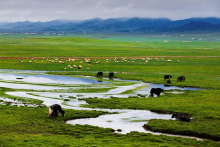 祁連山草原因交融之美,被評為“中國最美的六大草原”之一,具有面積大、草質(zhì)好、類型多、產(chǎn)草量高等特點,有罕見的林中草場。海拔4000以上還有高山積雪形成的碩長而寬闊的冰川地貌奇麗壯觀。進入祁連境內(nèi),放眼望去,滿目盡是草原旖旎的風(fēng)光。夏季的草原像是廣袤無垠的綠毯,滿山的白藏羊恰似散落的珍珠,黑色的牛毛帳篷、裊裊升起的炊煙、牧人悠揚的歌聲,這一幕如畫風(fēng)景卻是草原最尋常的景色。