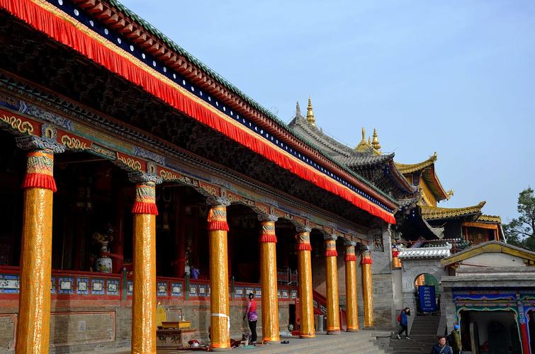 又稱文殊菩薩殿,為漢式硬山頂建筑,面闊九間,進(jìn)深三間,面積592平方米。初建于明萬(wàn)歷二十年(公元1592年),清雍正十二年(公元1734年)擴(kuò)建。廊柱為藏式朱色八楞柱。整座大殿以三間為一單元,由北向南分別為獅子吼佛殿、文殊殿和宗喀巴殿;ㄋ掠址Q祈壽殿,建于清康熙五十六年(公元1717年),系一獨(dú)立的小庭院,殿為兩層重檐歇山頂建筑。柱頭梁枋都飾以飛禽、走獸、花卉、文紋,院墻飾琉璃磚雕。殿內(nèi)供奉釋迦牟尼、十六羅漢和四大金剛等塑像。