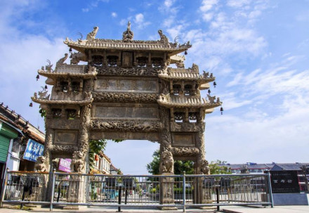 是典型清代石雕建筑,俗稱張家牌坊,被譽(yù)為“天下第一坊”,位于牌坊街中段。因其夾柱精雕一百個(gè)姿態(tài)各異的石獅子而得名,寓有“百事(獅)如意,百世(獅)多壽(獸)”之意。乃清乾隆四十三年(1778年)為贈(zèng)文林郎張蒲妻朱氏而建,全石結(jié)構(gòu),高14米,寬9米,四柱三間五樓式,正間單檐,次間正檐,歇山頂,全部石砌。坊座八根夾柱透雕群獅八組,大獅子獰猛崢嶸,小獅子環(huán)繞戲耍。每根夾柱前、左、右三面均浮雕松獅圖。四柱和枋額上透雕云龍,其它部位也透雕加浮雕云龍旋舞,珍禽異獸、花卉圖案。