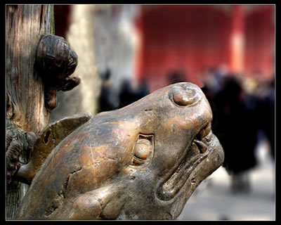 洙水橋北,先是一座綠瓦三楹的高臺(tái)大門——擋墓門,后面就到了供奉孔子木主的享殿。去享殿的甬道旁,有四對(duì)石雕,名曰華表、文豹、角端、翁仲。華表系墓前的石柱,又稱望柱;文豹,形象似豹,腋下噴火,溫順善良,用以守墓;角端,也是一種想象的怪獸,傳說日行1萬8千里,通四方語言,明外方幽遠(yuǎn)之事;翁仲,石人像,傳為秦代驍將,威震邊塞,后為對(duì)稱,雕文、武兩像,均稱翁仲,用以守墓。兩對(duì)石獸為宋宣和年間所刻,翁仲是清雍正年間刻制的,文者執(zhí)笏,武者按劍。甬道正面是享殿,殿廣5間,黃瓦 歇山頂,前后廊式木架,檐下用重昂五踩斗栱。殿內(nèi)現(xiàn)存清帝弘歷手書“謁孔林酹酒碑”,中有“教澤垂千古,泰山終未頹”等詩句。解放戰(zhàn)爭時(shí),朱德總司令曾在此殿內(nèi)召開過軍事會(huì)議。