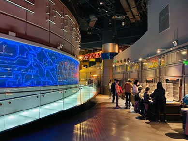 上?萍拣^科學影城擁有四個風格迥異的特色影院:IMAX立體巨幕影院、 IWERKS 四維影院、 IMAX 球幕影院、太空數(shù)碼影院。這四個特色影院分布在科技館的展區(qū)中,組成了亞洲地區(qū)最大的科學影城。影城共有800多個座位。巨幕影院、球幕影院位于地下一層,四維影院位于地面一層,太空影院位于地面三層。