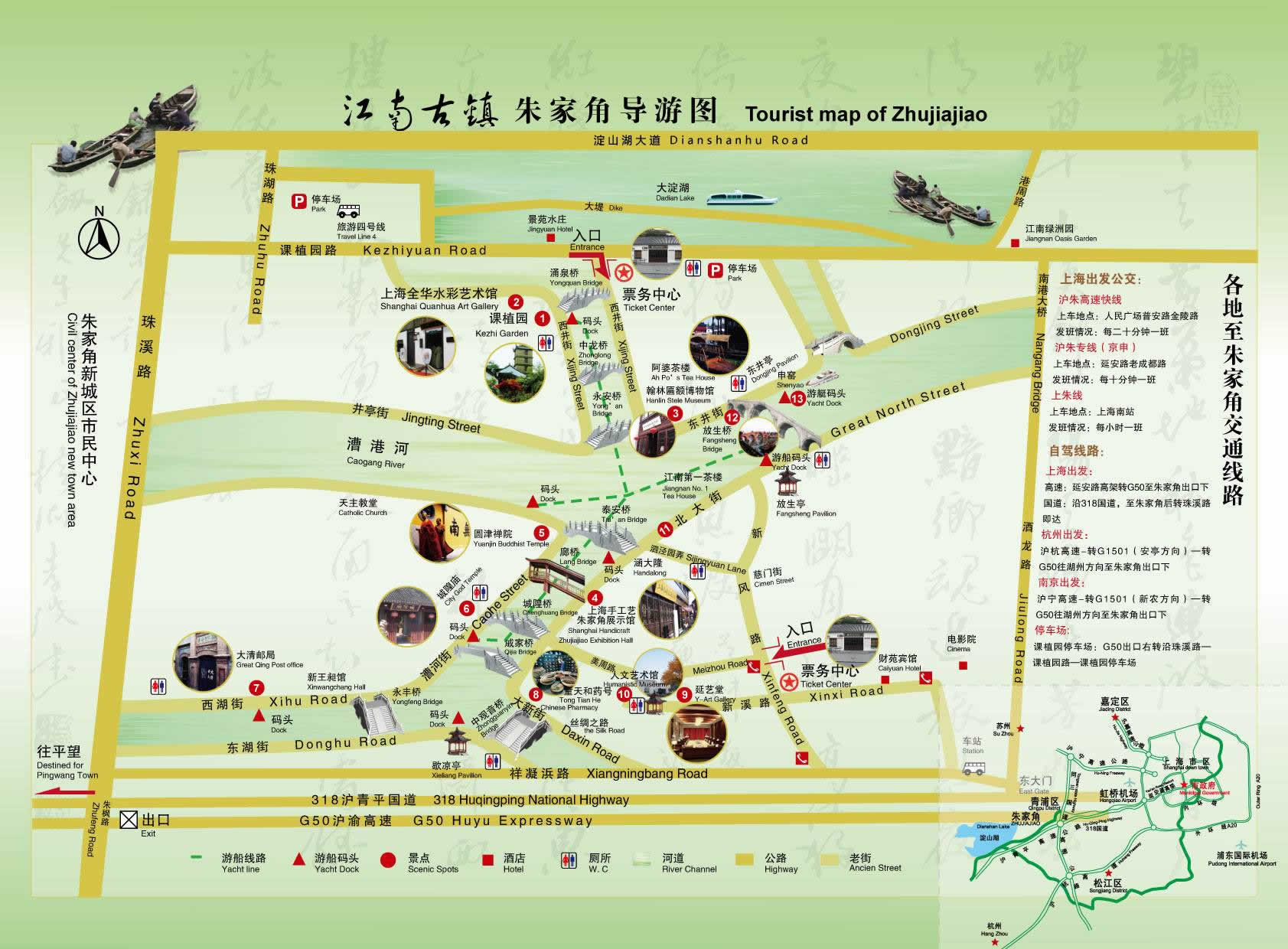 朱家角古鎮(zhèn)旅游區(qū)地處江、浙、滬二省一市交通要樞,地理位置十分優(yōu)越,東靠虹橋國際機(jī)場,北連昆山,南接嘉興,西通平望,淀山湖下游、黃金水道漕港河穿鎮(zhèn)而過。鎮(zhèn)內(nèi)河港縱橫,九條長街沿河而伸,千棟明清建筑依水而立,36座石橋古風(fēng)猶存,名勝古跡比比皆是。在玩膩了一個個雷同價高的人造景觀后,人們莫不驚訝于上海市郊還有一塊保存得如此完好的原汁原味、真山真水的天然景觀,在這里可以尋找一種回歸自然,崇尚野趣的享受。無怪乎一位同濟(jì)大學(xué)的名教授在考察朱家角古鎮(zhèn)旅游區(qū)后,不覺贊嘆:“朱家角古鎮(zhèn)旅游區(qū)有這么豐富的文化遺產(chǎn),不僅是上海一寶,也是國家的瑰寶”。臺灣著名已故作家三毛,到此曾為“小橋、流水、人家”的格局而迷戀,為清淳幽靜,處處可畫、時時有詩的風(fēng)情而陶醉。中共中央政治局委員、國務(wù)院副總理吳邦國在視察了古鎮(zhèn)朱家角古鎮(zhèn)旅游區(qū)后,不禁欣然命筆,寫下了“全國歷史名鎮(zhèn)朱家角古鎮(zhèn)旅游區(qū)”幾個大字。
