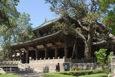 圣母殿前檐廊柱上飾有八條蜿蜒欲動的木雕龍,是中國現(xiàn)存最早的木雕盤龍柱。其中,六條雕龍制于宋元祐二年(1087年),兩條為宋崇寧元年(1102年)増加,八條龍各抱一根大柱,怒目利爪,栩栩如生。圣母殿正面臺基兩側(cè)還有兩條無角的石雕螭首。
