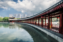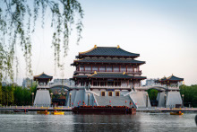 大唐芙蓉園,位于陜西省西安市雁塔區(qū)大雁塔東南側(cè),占地面積1000畝,其中水域面積300畝。大唐芙蓉園是在原唐代芙蓉園遺址以北,仿照唐代皇家園林式樣重新建造的,是中國(guó)第一個(gè)全方位展示盛唐風(fēng)貌的大型皇家園林式文化主題公園。