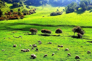 群山競秀,溪壑密布,林木參天,草場綿延不絕。森林沿圓潤柔和的山體從上到下呈放射狀分布,與廣闊肥腴的草原相間,形成了獨特的地理形態(tài)。組成草原的山巒重重疊疊,蜿蜒起伏,和舒緩寬闊的山谷坡地密切銜接,延綿不斷。幽澗水澤穿行于腹地,或囤積成片分布在大大小小的草坡上,或森林間,使得草原地面表層常年濕潤無比。春秋季節(jié),游人絡(luò)繹不絕的蜂擁而至,踩在青翠碧綠的草面上,常會為被地表的柔軟和從鞋子周圍緩緩溢出的水感到驚訝。由于受垂直地帶性地理條件的影響,終年氣溫較低,春秋相連,冬長無夏,素有“關(guān)山六月猶凝霜”的寫照。因其地貌酷似中歐的阿爾卑斯山,故有些旅游資料上稱其是“具有歐式風(fēng)情的游覽勝地”。
