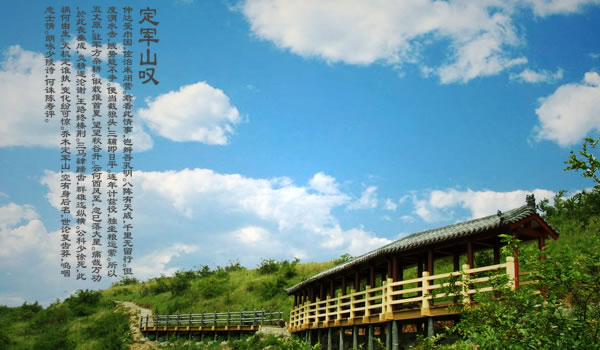 定軍山:定軍山位于陜西省漢中市勉縣城南5千米,三國時(shí)期古戰(zhàn)場(chǎng)。為省級(jí)風(fēng)景名勝區(qū)。原屬武侯墓鄉(xiāng),今屬定軍山鎮(zhèn)轄區(qū)。三國時(shí),蜀將黃忠斬夏侯淵、趙顒?dòng)诖,在歷史上遂負(fù)盛名。屬大巴山脈,其脈自高廟子入平地,隆起秀峰12座,自石山子至元山子,號(hào)稱“十二連峰”,再東為當(dāng)口寺孤峰,自西向東綿延十多公里,如游龍戲珠,故有“十二連山一顆珠”之譽(yù)。主峰定軍山為最高處,海拔833米,山頂原有“古定軍山”石碑,文革被毀,今新立。山南有一個(gè)天然鍋底形的大洼,周長(zhǎng)1.5千米,即三國時(shí)稱為“可屯萬兵”的“仰天洼”。北麓有一片廣漠沃野,就是當(dāng)年諸葛亮大布“八陣圖”、設(shè)“督軍壇”的武侯坪,黃忠大戰(zhàn)夏侯淵的戰(zhàn)場(chǎng),時(shí)常發(fā)現(xiàn)“扎馬釘”和箭鏃,傳為蜀軍用兵之物;山旁有“斬將橋”,“八角琉璃井”井口八角形,薄頁細(xì)花紋漢磚砌成,皆不存。山半腰有一大石,高約3.3米,寬約2米,中開一縫,寬窄不一,名曰“擋箭牌”,傳為諸葛亮遮擋敵箭的遺物。
