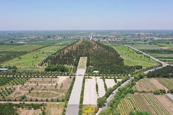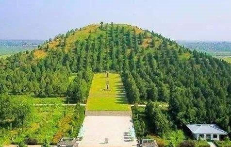 上述與今測量數(shù)字基本相符?傉嫉孛娣e計為56878.25平方米,封土體積848592.92立方米。陵園四周呈方形,平頂,上小下大,形如覆斗,顯得莊嚴(yán)穩(wěn)重。