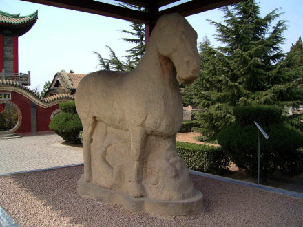 茂陵的群雕獸像、人獸相博的藝術(shù)造型,是漢武帝留在茂陵的十分珍貴的重大文化遺產(chǎn),空前啟后的“國之瑰寶”,是兩千多年前漢文化遺產(chǎn),是中國大型雕刻的鼻祖,是中國迄今發(fā)現(xiàn)時代最早、體積最大、保存最完整、最具有藝術(shù)價值的大型石刻群,在十四件造像巨雕作品中有十二件被國家文物局鑒定為“國寶”。中國美術(shù)家協(xié)會主席劉開渠,著名作家賈平凹以及前輩文史大師郭沫若等,都曾對其有“嘆為觀止”的贊賞。特別值得指出的是,這批巨雕中的“馬踏匈奴”、“躍馬”、“起馬”,最受歷代學(xué)者和游人的推崇,并認(rèn)為這些“馬”的作品,可能出自漢武帝的授意。漢武帝癡愛寶馬,天下聞名。在中國歷史上,為能得到寶馬、良駒而出詩作的皇帝,漢武帝是第一人。