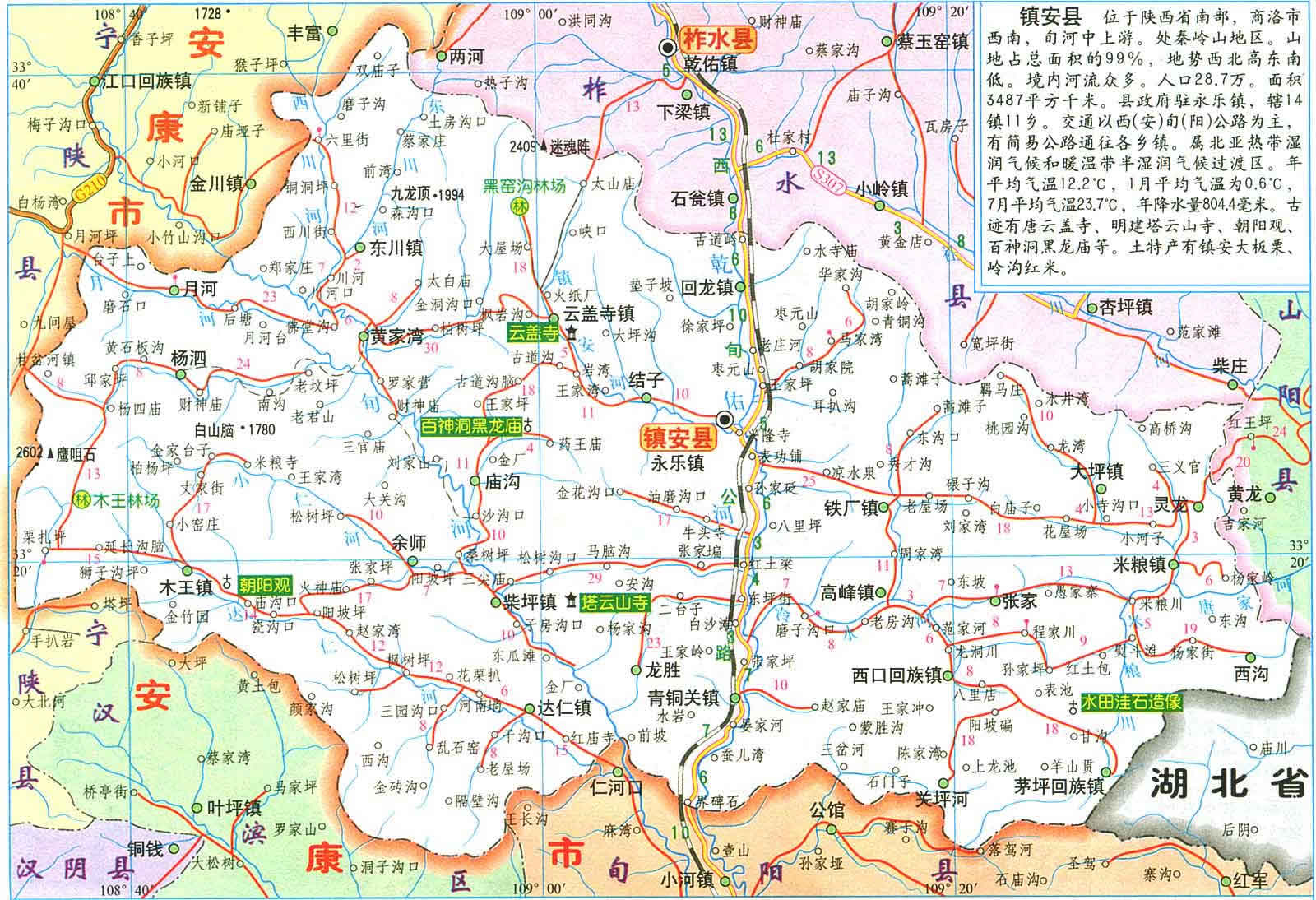 鎮(zhèn)安縣位于陜西省東南部,秦嶺南麓,商洛市西南,位于漢江支流乾佑河與旬河中游,北到北緯33°48′57″與柞水縣相連,南到北緯33°8′44″與旬陽縣、安康市接壤,西到東經(jīng)108°34′16″與寧陜縣相鄰,東到東經(jīng)109°36′55″,與山陽縣和湖北省鄖西縣相交。東西長175.5km,南北寬72.5km,全縣國土總面積約為3487km2,全縣有205個行政村,3個社區(qū),1060個村民小組,第五次人口普查資料顯示:2000年11月1日0時,戶籍總人口為29萬零138人(包括外出務工人口不包括外來人口)。