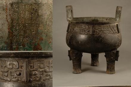 鑄于周康王時期,造型敦厚雄偉,紋飾莊重神奇。通高77厘米,口徑56.5厘米。立耳,深腹,平沿方唇,三柱足。口沿下飾浮雕狀饕餮紋,地襯細雷紋。三足根部飾大饕餮面。雙耳外側(cè)各飾一條曲體上緣的夔龍。腹外壁及底部厚積煙跡,顯系長期使用所致。腹內(nèi)壁鑄有銘文28字。旟鼎承襲商代圓鼎風(fēng)格,造型厚重莊嚴(yán),紋飾十分精美,所刻銘文是研究周初土地制度的重要史料,具有珍貴的歷史及藝術(shù)價值,加之鑄刻時代明確,被公認為周康王時的標(biāo)準(zhǔn)器,是一尊著名的西周時期的國寶。