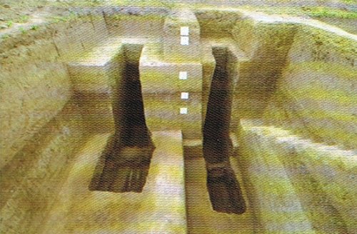 墓地東、西、北部均有圍溝環(huán)繞,形成長(zhǎng)321、寬273米南部敞開(kāi)的南北向長(zhǎng)方形墓園。墓葬群位于墓園正中偏北,墓地中軸延長(zhǎng)線正南500米處為呂氏家廟“呂氏莊閣云寺”故址。墓葬排列脈絡(luò)清晰,中軸線上自南向北縱向貫魚式為長(zhǎng)子長(zhǎng)孫系列,橫向則按輩份分排布置。墓地使用時(shí)間為宋神宗熙寧七年(公元1074年)至徽宗政和元年(公元1111年),共計(jì)埋葬五代呂氏族人。