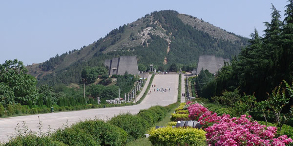 乾陵,是中國(guó)乃至世界上獨(dú)一無(wú)二的一座兩朝帝王、一對(duì)夫妻皇帝合葬陵。里面埋葬著唐王朝第三位皇帝高宗李治和中國(guó)歷史上唯一的女皇帝武則天,是全國(guó)重點(diǎn)文物保護(hù)單位。建于公元684年,歷時(shí)23年才修建完成。乾陵修建于公元684年,經(jīng)過(guò)23年的時(shí)間,工程才基本完工。氣勢(shì)雄偉壯觀。乾陵位于陜西咸陽(yáng)市乾縣城北6公里的梁山上。梁山是圓錐形石灰?guī)r山體,共有三峰,北峰最高,海拔1047.9米,乾陵就在北峰之上。梁山南面兩峰較低,東西對(duì)峙,中間為司馬道,故而這兩峰取名叫“乳峰”。據(jù)史書記載,陵墓原有內(nèi)外兩重城墻,四個(gè)城門,還有獻(xiàn)殿闕樓等許多宏偉的建筑物?碧奖砻鳎簝(nèi)城總面積240萬(wàn)平方米。城墻四面,南有朱雀門,北有玄武門,東有青龍門,西有白虎門。從乾陵頭道門踏上石階路,計(jì)537級(jí)臺(tái)階,其臺(tái)階高差為81.68米。走完臺(tái)階即是一條平寬的道路直到“唐高宗陵墓” 碑,這條道路便是“司馬道”。兩旁現(xiàn)有華表1對(duì),翼馬、鴕鳥各1對(duì),石馬5對(duì),翁仲10對(duì),石碑2道。東為無(wú)字碑,西為述圣記碑。有王賓像61尊,石獅1對(duì),周圍還有17座陪葬墓。“唐高宗陵墓”墓碑,高2米,是陜西巡府畢源為高宗所立,原碑已毀,現(xiàn)在這塊碑是清乾隆年間重建的。此碑右前側(cè)另一塊墓碑,是郭沫若題寫的“唐高宗李治與則天皇帝之墓”12個(gè)大字。另外在南門外有為高宗皇帝和武則天歌功頌德的《述圣記碑》和《無(wú)字碑》二通以及參加高宗葬禮的中國(guó)少數(shù)民族首領(lǐng)和友好國(guó)家使臣的石刻像六十一尊。在中國(guó)歷史上,陵前石刻的數(shù)目、種類和安放位置是從乾陵開始才有了固定制度的,一直延襲到清代,歷代大同小異。