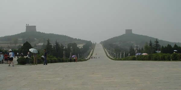 此景距縣城6公里,與乾陵渾然一體,乾陵朱雀門南面從兩乳峰之間通向獻(xiàn)殿的御道兩側(cè),豎有華表,石馬(翼馬)、駝馬、翁仲、述圣紀(jì)碑、無(wú)字碑、石獅、六十一賓王等大型精細(xì)石雕,120多尊依次排列。石馬在前,雙翅高振,凌空欲飛,栩栩如生,其他石雕左右配置,緊隨其后,魁梧奇?zhèn),氣象萬(wàn)千,被史學(xué)界譽(yù)為“唐代露天石雕藝術(shù)博物館”。近年來(lái),國(guó)家文物旅游局又投巨資,對(duì)34尊石雕扶直加固,對(duì)御道鋪石美化,使此景更加恢宏壯觀。