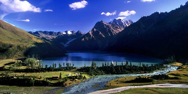 雀兒山屬沙魯里山脈北段,地勢呈西北——東南走向,是典型的冰川地貌,海拔5000米以上的山峰有30座,最高峰絨麥俄扎,海拔6168米,終年積雪不化,是四川省第四高峰。雀兒山下的新路海風(fēng)景區(qū)在川藏公路之側(cè),距德格縣城100公里,海拔4040米。新路海平均深度10米,最深處15米,是甘孜州著名的冰蝕湖。水源由雀兒山冰川和積雪消融供給,湖尾流出的溪流為措曲河源頭之一。新路海藏語各玉龍拉措,意為“傾心之湖”,相傳格薩爾王傳的愛妃珠牡來到湖邊,被秀麗的湖光山色和幽靜的環(huán)境所吸引,緋徊湖邊留連忘返。后人為了紀(jì)念珠牡,取名“玉龍拉錯”。玉龍拉錯及周圍生態(tài)原始、完整、晶瑩的冰川從海拔五千米的粒雪直瀉湖濱草原,極為壯觀。湖泊周圍由高原云杉、冷杉、柏樹、杜鵑樹和草甸環(huán)繞。藍(lán)天白云,雪峰皚皚,冰川閃爍,青山融融,綠草茵茵,波光粼粼。湖岸珍禽異獸出沒,湖中野鴨成群,魚兒游弋,夏秋季節(jié),山花爛熳,爭芳斗艷,真可謂世間仙境。