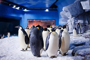 在1000㎡的企鵝館中,生活著一群搖搖擺擺的企鵝家族,在這里人們可以近距離觀摩神氣的“帽帶企鵝”、非常優(yōu)雅紳士的“王企鵝”等,它們時而靜立,時而搖擺,非常呆萌。