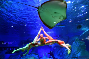 徜徉于多彩的海底世界,一覽多彩珊瑚、熱帶魚群以及兇猛的鯊魚構成的海底世界。美麗的俄羅斯水秀演員、童話里的美人魚,搖曳身姿,共同舞動海底深處的視覺奇跡。探訪深海的馴養(yǎng)師也將攜手兇猛鯊魚,演繹人鯊共舞。