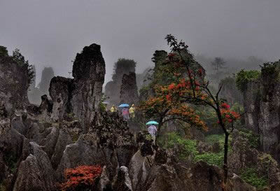 華鎣山的石柱雄壯秀拔,石生樹、樹纏石等自然景觀隨處可見,旅游區(qū)內的植被更是枝葉繁茂、郁郁蔥蔥。經初步估算旅游區(qū)內的植被種類竟達304種之多。珍稀的香果樹、穗花杉等多種國家一、二級的保護植物似珍珠般的散落于旅游區(qū)。山下以松樹、杉樹為主;山上以藤蔓、稀有樹種為主;茂密的白夾竹、茨竹、方竹、灌木、喬木漫山遍野,掩映于奇特的石林之中,植被覆蓋率達95%以上的旅游區(qū)格外耀眼壯觀。而個別的罕見的植物植物學家們至今難以對它命名,從而更增加華鎣山神秘的色彩。