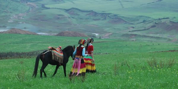 跑馬坪生態(tài)環(huán)境教育區(qū)位于覺嘎失山頂呈波狀起伏的亞高山草甸中,面積達(dá)10萬平方米以上,草甸中部有一長 約200米的天然環(huán)形溝槽,雨季時溪流清澈但不見首尾。草甸東側(cè)形成若干草甸沼澤化淺水區(qū),且有矮型高山櫟,矮林型杜鵑點(diǎn)綴其中。海拔3105~3185米之間。本區(qū)特色為亞高山灌叢凸現(xiàn)于亞高山草甸中,草甸東側(cè)形成若干草甸沼澤化淺水區(qū)大面積的高山草甸生長著茂盛的中生雜草和和禾草,為糙蘇羽衣草群系。其它主要伴生種有小米草、瀴蔢草、金蓮花、假水蘇禾龍膽等。騎馬徜徉在跑馬坪上讓人覺得天寬地迥,暢意無限。其景觀見圖二