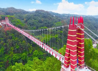 七洞溝9D云海玻璃橋橫騎南屏山山脈與佛來(lái)山山脈峽谷之上,全長(zhǎng)386米,寬3.3米,垂直落差188米,在中國(guó)西南部地區(qū)長(zhǎng)、寬、高都名列第一,是長(zhǎng)寧旅游大發(fā)展靚麗新畫(huà)卷之一。玻璃橋采用最新9D技術(shù),以仿真場(chǎng)景與感應(yīng)設(shè)置模擬多種特殊效果、立體畫(huà)面,將視覺(jué)、聽(tīng)覺(jué)、觸覺(jué)和動(dòng)感完美地融為一體,給游客帶來(lái)驚心動(dòng)魄的刺激感受。走在橋上,不僅可以俯瞰綿溪河,還可以飽覽南屏山脈、佛來(lái)山脈等2座群山的英姿;晴天時(shí),藍(lán)天和白云的倒影鋪滿(mǎn)天橋,讓人在對(duì)透明的腳下戰(zhàn)戰(zhàn)兢兢之余,更樂(lè)享于踏云而行的快感;而云霧天氣時(shí),玻璃橋則在霧中若隱若現(xiàn),天上人間的美景更是讓人驚嘆不已。