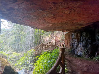 甘泉洞是丹霞地貌中罕見(jiàn)的的大型洞穴,洞長(zhǎng)約200米,寬近20米,高約6米。因?yàn)樗且粋(gè)常年無(wú)水的干的巖洞,當(dāng)?shù)卮迕穹Q(chēng)為“干巖洞”,洞內(nèi)冬暖夏涼,蚊蟲(chóng)不生。對(duì)洞穴的形成原因,專(zhuān)家認(rèn)為有三個(gè):一是巖石的差異風(fēng)化。在抗風(fēng)化能力強(qiáng)的巨厚的砂巖下,沉積了抗風(fēng)化能力弱的泥巖,泥巖不斷風(fēng)化,洞穴越來(lái)越大、越來(lái)越寬。二是河水的不斷沖刷。巖洞底部與溪流的河床齊平,年年暴漲的洪水的不斷沖刷,也是洞穴不斷擴(kuò)大。三是附近村民的人為采石。村民采石修路,打掉了洞穴中部分堅(jiān)硬的巖石,擴(kuò)大了洞穴容積。