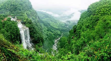 七彩飛瀑又名落魂臺(tái)!督部h志》載:“萬(wàn)嶺箐南北飛瀑,殆似廬山”。不擇地而出的泉水,使得深邃幽深的竹海充滿(mǎn)靈氣,山巖跌宕處,每每作了懸泉飛瀑。山間數(shù)十條姿態(tài)各異的瀑布中,最為壯觀的,當(dāng)數(shù)七彩飛瀑。七彩飛瀑處在石鼓山和石鑼山之間的葫蘆谷中,從深林里流出的水潦河,在回龍橋下分為四級(jí)瀉下懸崖,落差近200米,蔚為壯觀。瀑布上頭,還有石龍過(guò)江、孟獲墳、古較場(chǎng)等景點(diǎn)。一湖碧水映藍(lán)天翠竹;湖水的寧?kù)o,與瀑布的飛動(dòng)相互映照。