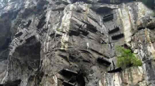 珙縣洛表麻塘壩和蘇麻灣是僰人懸棺最集中的地方,僅在縱深四千米長的麻塘壩懸崖絕壁上,現(xiàn)存上萬個(gè)棺樁棺孔;數(shù)百具懸棺,是世界上懸棺分布最集中,保存最完好,數(shù)量最多的地區(qū),被譽(yù)為“世界一絕”、“天然懸棺葬的博物館”。其悠久的歷史,神奇的傳說,神秘的文化,獨(dú)特的葬式,耐人尋味,千古難解。同時(shí),隨棺而作的數(shù)百幅巖畫,色彩鮮艷,栩栩如生;形象地再現(xiàn)了僰人時(shí)代的自然環(huán)境、社會(huì)生產(chǎn)、民風(fēng)民俗、宗教信仰,令人折服。入口處的“九盞燈”,因傳說三根橫木上共放有九盞“長命燈”而得名,它前有點(diǎn)將臺(tái);右有石船。形如斧砍的石灰?guī)r絕壁上,分布了二十四具懸棺、六十二幅巖畫。懸棺神奇絕妙,府瞰萬眾;巖畫題材廣泛,內(nèi)容豐富,牽馬放牧,垂鉤釣魚、舞蹈、球戲、踢鍵娛樂。雖然構(gòu)圖簡練,線條粗獷,卻富有濃郁的生活氣息和鮮明的民族風(fēng)格。而最遠(yuǎn),最高的當(dāng)數(shù)老鷹巖;14具懸棺懸置在110余米的峭壁上,為懸棺精華。而蘇麻灣山勢(shì)巍峨;奇巖崢嶸,河水澄澈清瑩,山光水色相映成趣,優(yōu)美迷人,在距水面50余米的懸崖峭壁上重重疊疊的放有50具懸棺,并留有大量樁孔,給人以奇異神秘的感受。另外,麻塘壩謝家灣,留有一民國建筑一何家大院,已有180多年的歷史,占地15畝,全為木質(zhì)結(jié)構(gòu),有三座院落,一個(gè)花園,二座石碉樓;雕刻精美,巧妙絕倫。