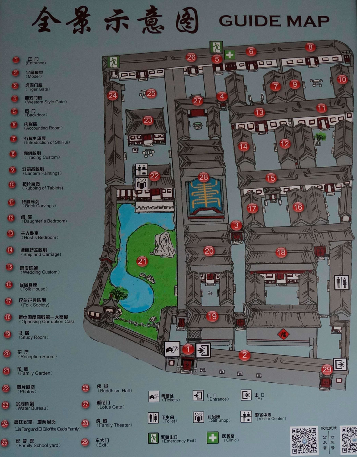 甬道的東側(cè),原是石氏家族的起居寢室,現(xiàn)在是展品陳列區(qū),陳列了楊柳青木版年畫的歷代杰作和磚雕藝術(shù)品。甬道西側(cè),主要有花廳、戲樓、佛堂等建筑,是石氏家族會晤賓朋、娛樂消閑、誦經(jīng)禮佛的場所,現(xiàn)辟為博物館的“石府復(fù)原陳列區(qū)”;◤d即客廳,現(xiàn)已按照原來的陳設(shè)進行復(fù)原。與花廳一墻之隔的是戲樓,這是北方最大的民宅戲樓,造型落落大方,特別是以美輪美奐的內(nèi)部裝點著稱于世,令觀者瞠目。出佛堂,往西跨一道隔扇門,就是“天津民俗陳列館”了,這里展現(xiàn)了具用濃郁地方民間特色的楊柳青風箏、剪紙、花會道具以及婚俗等。大院建筑的內(nèi)外檐裝修,用料考究,作工精細,磚雕木刻形式多樣,是清代津沽豪富住宅常見的做法。