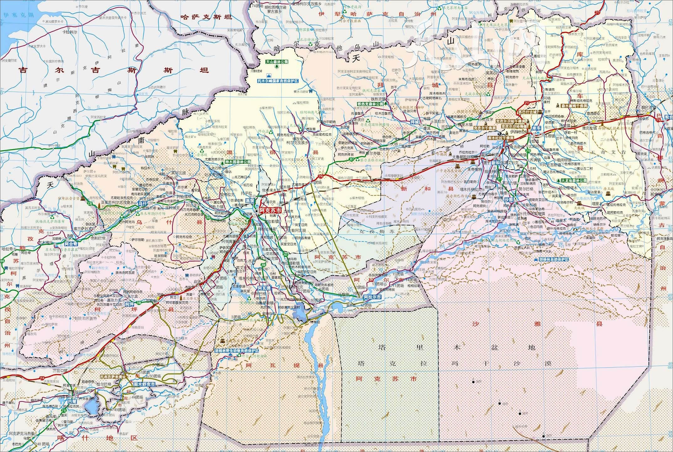 阿克蘇地區(qū)轄2個(gè)縣級(jí)市、7個(gè)縣: