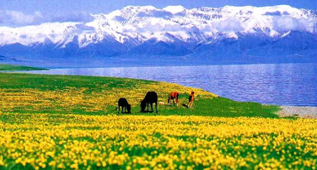 賽里木湖古稱(chēng)“凈海”,位于中國(guó)新疆博爾塔拉州博樂(lè)市境內(nèi)的西天山山脈中,緊鄰伊犁州霍城縣,是一個(gè)風(fēng)光秀美的高山湖泊。賽里木湖湖面海拔2073米,水深85公尺,東西長(zhǎng)約30公里,南北寬約25公里,周長(zhǎng)90公里,水域面積460平方公里,是新疆海拔最高、面積最大的高山冷水湖。 [16]賽里木湖蒙語(yǔ)稱(chēng)“賽里木淖爾”,意為“山脊梁上的湖”,面積約458平方公里,水質(zhì)透明度達(dá)10—12米。