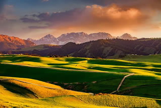 江布拉克是哈薩克語,意為圣水之源。她集結了天山之靈氣,并融入諸多美麗的傳說。在這里,遠山近水相映,林海雪峰交融,綠波花海如潮,一派圣潔的自然風光。美麗的江布拉克,以其秀美迷人,如詩如夢的花海子,明靜清幽的黑澇壩,世界之最的天山怪坡,以及阡陌縱橫的田園風光吸引著眾多游人的目光。
