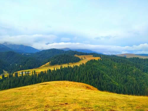 夏季,在每年的6、7月份是避暑消夏的季節(jié)。初到這里的人,會錯覺以為到了瑞士:沒膝的黨生花、貝母花和一種叫不上名的小黃花漫山遍野,就像神仙種植的一樣,在草地里自然生長為好幾層。爭奇斗妍,沁人心脾的花香令人陶醉;遠處群山起伏,層巒疊嶂,連綿不斷,蒼松翠柏直插云霄,雪峰、林海和綠草鮮花構成了一副秀麗的山水畫卷;行走在這綠茸茸、濕漉漉的草地上,涼風習習,盡情呼吸新鮮的空氣和花草的芳香,一種心靈被大自然凈化的感覺油然而生。再往里面走就是雪山,皚皚的積雪終年不化。騎馬可以到達雪山腳下,那里溫度急劇下降,剛才還是短褲T恤,就得穿上厚棉衣。身上還是烈日曬著,頭頂一朵云飄過,很可能就是一陣瓢潑大雨,讓你看著太陽卻渾身濕透。過一會雨停了,山風已不知不覺吹干了你的衣服。