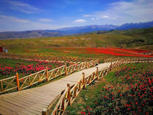 斷橋名字的由來有兩種說法:一種說法是,最初這里有一座橋,但總是會被水沖斷,故稱“斷橋”。另一種說法是,為了方便哈薩克牧民轉場時趕著牛羊通過,建在草地之上原本連續(xù)的木棧道,在此斷開一個缺口,得名“斷橋”。由此可直接踏上木棧道,沿路觀景,向上可仰觀氣勢磅礴的雪山、挺拔的松林,向下可俯視爛漫山花與草地上的牛羊,天山麥海、空中草原、林海雪峰,每一處景觀都美不勝收。