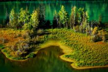 變色湖位于喀納斯湖中央。春夏時節(jié),湖水會隨著季節(jié)和天氣的變化而變換顏色。從每年的四五月間開化到11月冰雪封湖,湖水在不同的季節(jié)呈現(xiàn)出不同的色彩。5月的湖水,冰雪消融,湖水幽暗,呈青灰色;到了6月,湖水隨周山的植物泛綠,呈淺綠或碧藍(lán)色;7月以后為洪水期,上游白湖的白色湖水大量補(bǔ)給,由碧綠色變成微帶藍(lán)綠的乳白色;到了8月湖水受降雨的影響,呈現(xiàn)出墨綠色;進(jìn)入9、10月,湖水的補(bǔ)給明顯減少,周圍的植物色彩斑斕,一池翡翠色的湖水光彩奪目。