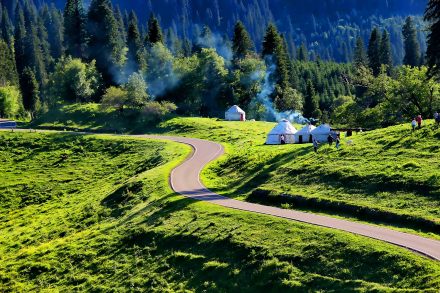 位于河谷草原線路、冰河景觀道、盤龍谷道的十字路口,由烏孫古部落、連心湖、哈薩克民俗文化展示區(qū)及牛欄餐吧組成,是哈薩克族民俗文化的集中展示區(qū),可親身體驗參與哈薩克族豐富多彩的生產生活,盡享草原民俗風情的淳樸謙和。走出依提更塞民俗體驗區(qū),向西穿過天光云影共徘徊的連心湖,就到了草木掩映中的“烏孫部落”。這里反映著哈薩克族原始的生活場景,沿著山林、草原、河岸,山水之遇。