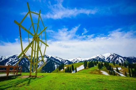 哈薩克語為“美麗的山溝”,是進入河谷草原的第一站,擁有一山四景,白雪皚皚的山峰、茂密的森林、連綿起伏的山丘、平坦的草甸,是草原垂直自然景觀帶的窗口。其東側的山坡形似天山母親的耳朵,聆聽著大地的聲音,默默守護著天山,被稱之為“天山之耳”。西南側的山坡形似一匹昂首奔騰的駿馬,見者“馬到成功,飛黃騰達”被取名為“飛馬坪”。