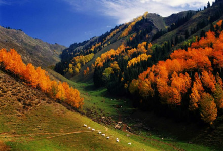 孜沿氈溝和馬鹿溝:溝谷內(nèi)谷深流急,濤聲隆隆,河水清涼純凈,河岸時(shí)而危巖矗立,時(shí)而寬闊平坦。溝谷內(nèi)植物依高矮不同分成5層,最高一層是云杉的圓錐形樹冠層,第2層是天山花楸,第3層是薔薇、忍冬、紅果小蘗,第4層是羽衣草、早熟禾、鹿蹄草、唐松草、天山鳶尾、高山羊角芹等200多種草本植物層,第5層是苔蘚、地衣。它們或相互依存,或獨(dú)在一方,把中山峽谷裝點(diǎn)得千種姿態(tài)、萬種風(fēng)情。溝谷內(nèi)野生動(dòng)物種類繁多,獸類有馬鹿、狍子、野豬、棕熊、狐貍、猞猁、石貂、艾虎、野兔等,鳥類有石雞、斑翅山鶉、黑鸛、柳鶯、星鴉、金額熊雀、紅額金翅雀、朱雀、鳶尾等。