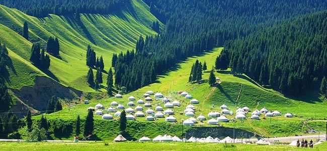 南山西白楊溝位于烏魯木齊南郊,距市區(qū)75千米,屬北天山的喀拉烏成山北麓,地處中山與低山過渡帶,海拔2252公尺,年降雨量500-600毫米。溝谷最里邊有一天然絕壁,其上,一條落差40余,寬約2米的飛瀑如白練飄舞,急瀉而下。草坡上有南山風景管理處開辦的氈房招待所,坡下有餐廳,可滿足游人食宿需要。