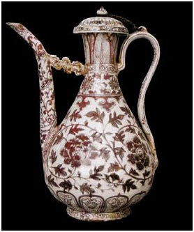 明洪武時(shí)期(公元1386年--1398年)贈(zèng)送的釉里紅牡丹紋執(zhí)壺,高37cm,足徑11cm,這是一件造型端莊美觀大方、繪工精細(xì)、十分鮮見的瓷器。由于釉里紅瓷器燒制難度大,成品率低,在現(xiàn)今中國內(nèi)地保存數(shù)量已很少,而在西藏能完好保存這件瓷品長(zhǎng)達(dá)600多年,實(shí)屬難得。