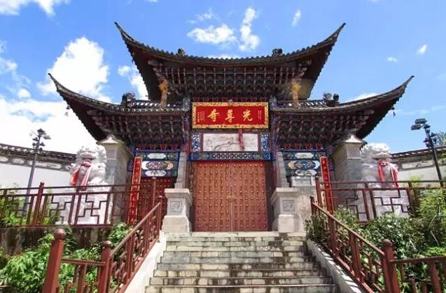 保山光尊寺,位于隆陽區(qū)板橋鎮(zhèn)世科村后的五鳳朝陽山。唐天寶二年(743年),南詔王皮邏閣為祭祀佛教尊神而建。座東朝西,依山形筑成七進五院,計有建筑物23幢,占地面積9000余平方米。是古代保山典型的三教合一的寺廟,又是保山現(xiàn)存寺廟規(guī)模最大的建筑群。太平洋戰(zhàn)爭爆發(fā)時期,中國遠征軍在此處設滇西抗戰(zhàn)指揮部。 2009年10月7日,光尊寺被列為第八批國家重點文物保護單位。