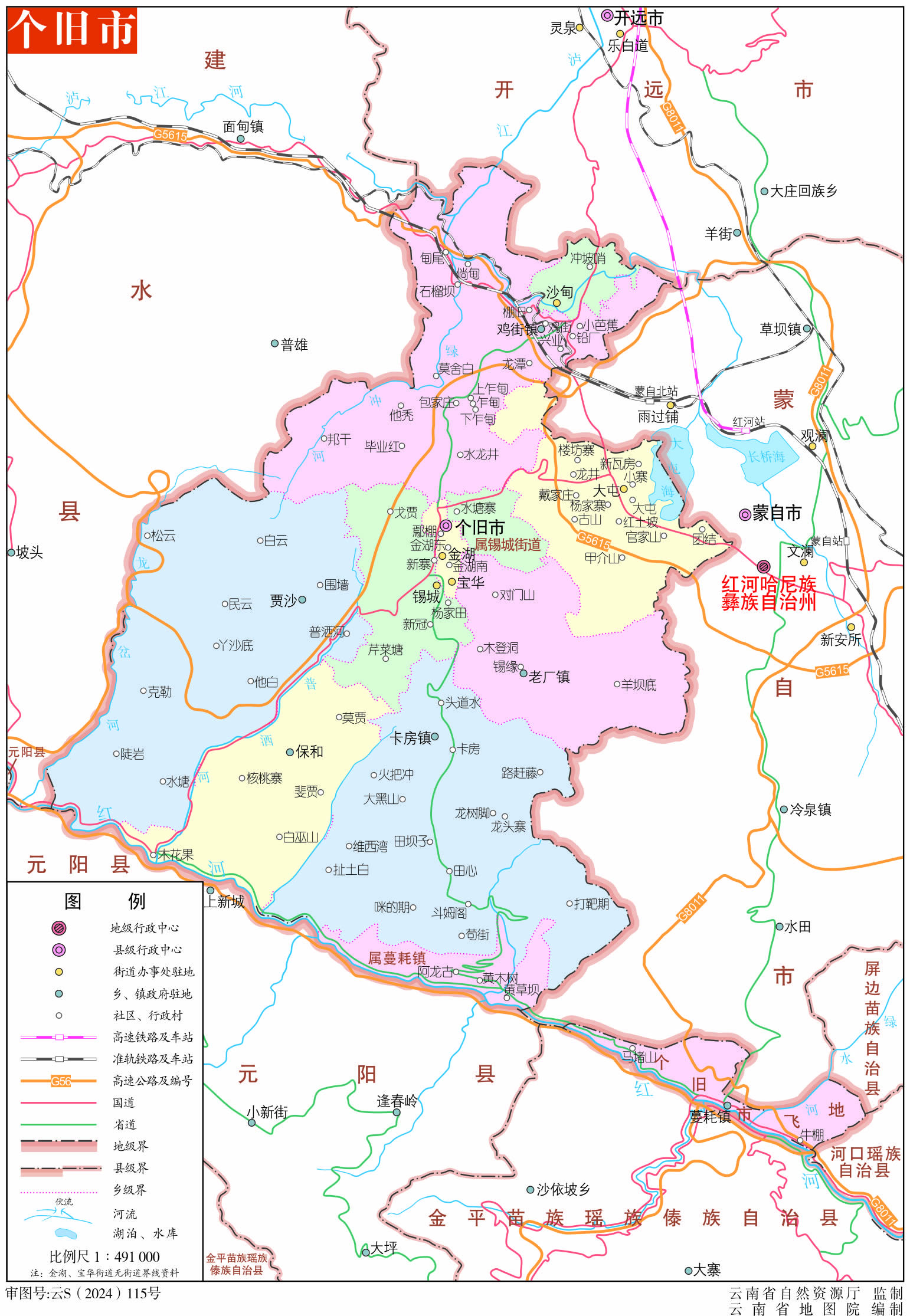 個(gè)舊市轄5個(gè)街道、4個(gè)鎮(zhèn)、2個(gè)鄉(xiāng):