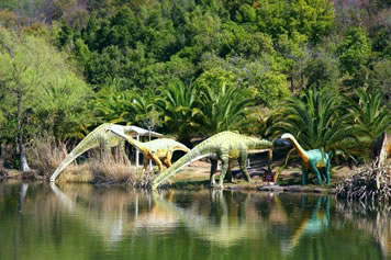 由“侏羅紀(jì)大瀑布”、“群龍對(duì)峙”、“腕龍相親”、“氣龍追逐”、“雙龍飲瀑”、“霸王龍窺獵”、“侏羅紀(jì)叢林”、“海棗之王”、“沙漠之林”等九大景觀真實(shí)再現(xiàn)了侏羅紀(jì)時(shí)代恐龍王國(guó)的生活場(chǎng)景,構(gòu)造出一個(gè)1億年前生氣勃勃、繁榮昌盛的侏羅紀(jì)世界,讓游客飽享一頓視覺(jué)大餐。