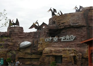 時(shí)空飛船:在一個(gè)不起眼的洞窟崖壁上有一架墜毀的飛船。進(jìn)入洞窟是一座神秘的飛船發(fā)射基地,從這里就是游客將乘坐“時(shí)空飛船”飛越侏羅紀(jì)。飛船會(huì)進(jìn)入神秘的時(shí)光隧道,游客將親歷地球生命演變和進(jìn)化的過(guò)程,在短短10分鐘內(nèi)走完地球生命幾十億年的演化歷程,最后進(jìn)入到侏羅紀(jì)世界。