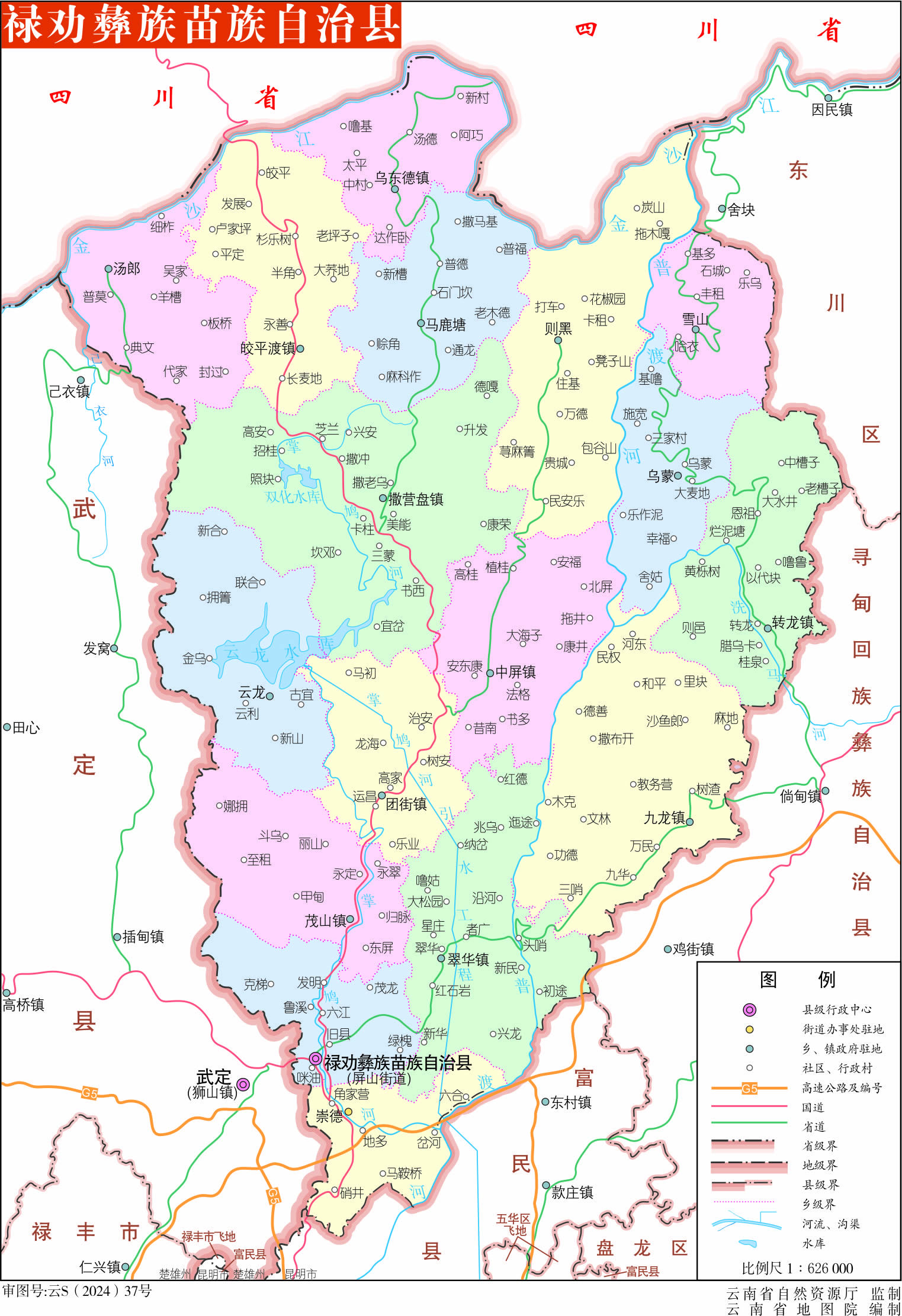 鎮(zhèn):撒營盤鎮(zhèn)、轉(zhuǎn)龍鎮(zhèn)、茂山鎮(zhèn)、團街鎮(zhèn)、中屏鎮(zhèn)、皎平渡鎮(zhèn)、烏東德鎮(zhèn)、翠華鎮(zhèn)、九龍鎮(zhèn)