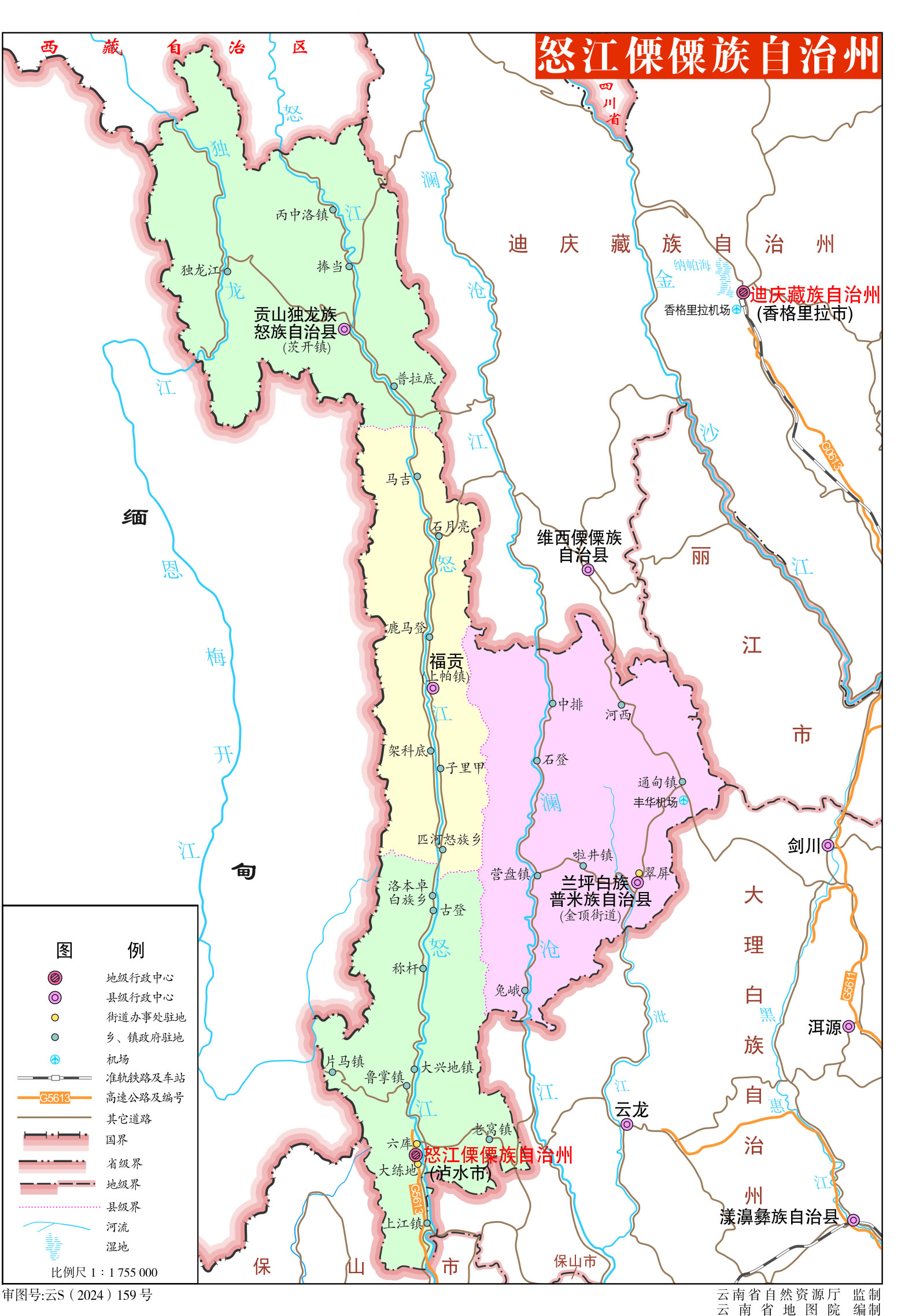怒江傈僳族自治州轄1個(gè)縣級市、1個(gè)縣、2個(gè)自治縣: