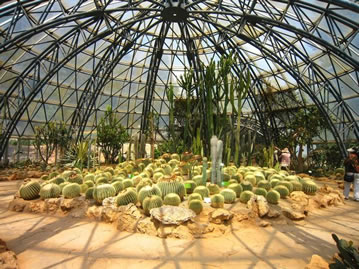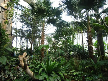 大溫室設(shè)計(jì)體現(xiàn)了鮮明的時(shí)代氣息。共分為四個(gè)展區(qū),分別是熱帶植物展區(qū)、溫帶植物展區(qū)、高寒植物展區(qū)(海拔3000米以上的植物)和圖片展覽館。三個(gè)植物展區(qū)由小到大,高度依次增加,屋面坡度也依次加大,形成一種螺旋上升的態(tài)勢(shì),暗喻人與自然和諧共存的辯證規(guī)律。立面采用高差變化處理、分段布置,寒帶展區(qū)8─12米高、溫帶展區(qū)10─16米高、熱帶展區(qū)10─20米高,打破了建筑形狀的單調(diào)感。根據(jù)三種氣候帶植物生長(zhǎng)環(huán)境及生態(tài)要求,各展區(qū)及內(nèi)部空間高低變化、斜屋面的設(shè)置,適宜于植物的合理布局和生態(tài)空間的需要。參觀者既可從室外隔著玻璃觀光,又可進(jìn)入室內(nèi)與展示環(huán)境充分融合,從不同的角度享受匠心巧作的自然風(fēng)光。
