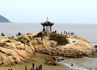 南天門地處普陀山南的南山上,與短姑道頭對峙。南天門孤懸入海,處于普陀山最南端,與該島一水相隔,架有石橋,橋身似龍,名環(huán)龍橋。此地巨石森立,危巖高聳,中有兩石如門,故名南天門。闕門飛檐起角,中間書有“南天門”三字,旁有龍眼井,崖上有石鼓,闕左上方有獅子石。南天門內(nèi)群巖聳秀,門前碧波浩渺,摩崖石刻眾多,門側(cè)有清康熙年間(1662年—1722年)武將藍理所題“山海大觀”四字。門里有梵宇琳宮,宇旁有一巨巖,可緣石級而登臨巖頂。巖頂平坦,有兩處小水潭,潭水清淳發(fā)光,俗稱獅子眼,巖石上鍥有“龍華大會”、“砥柱南天”、“海岸孤絕處”等石刻。傳說這里是八仙過海的地方,普陀山禪宗始祖真歇禪師曾結(jié)茅于此。
