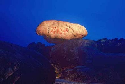 指磐陀石一帶的傍晚景色。由梅福庵西行不遠處便可看到磐陀石。磐陀石由上下兩石相累而成,下面一塊巨石底闊上尖,周廣20余米,中間凸出處將上石托住,曰磐;上面一塊巨石上平底尖,高達3米,寬近7米,呈菱形,曰陀。上下兩石接縫處間隙如線,睨之通明,似接未接,好似一石空懸于一石之上!