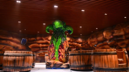 該館的“溶洞真景”位于“山之王國(guó)”地下,洞內(nèi)有石筍、石塔、石花等鐘乳石。此外,“水晶幻境”在燈光的配合之下,形成了溶洞內(nèi)的獨(dú)特景觀。